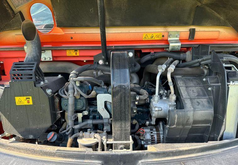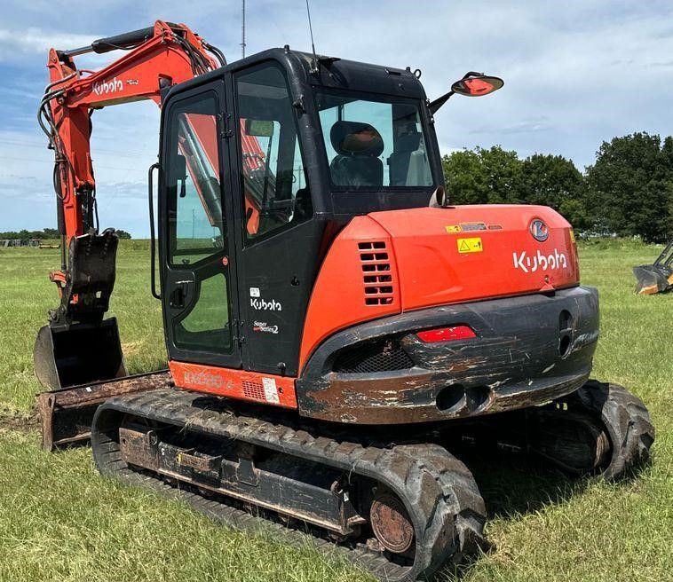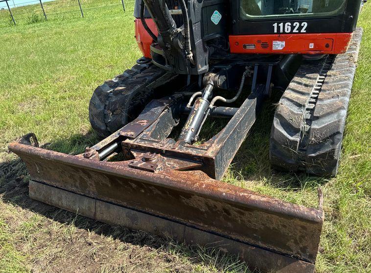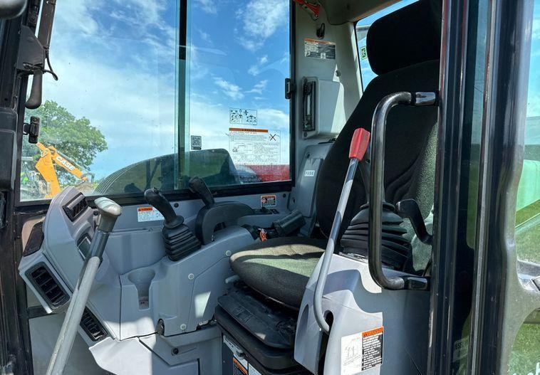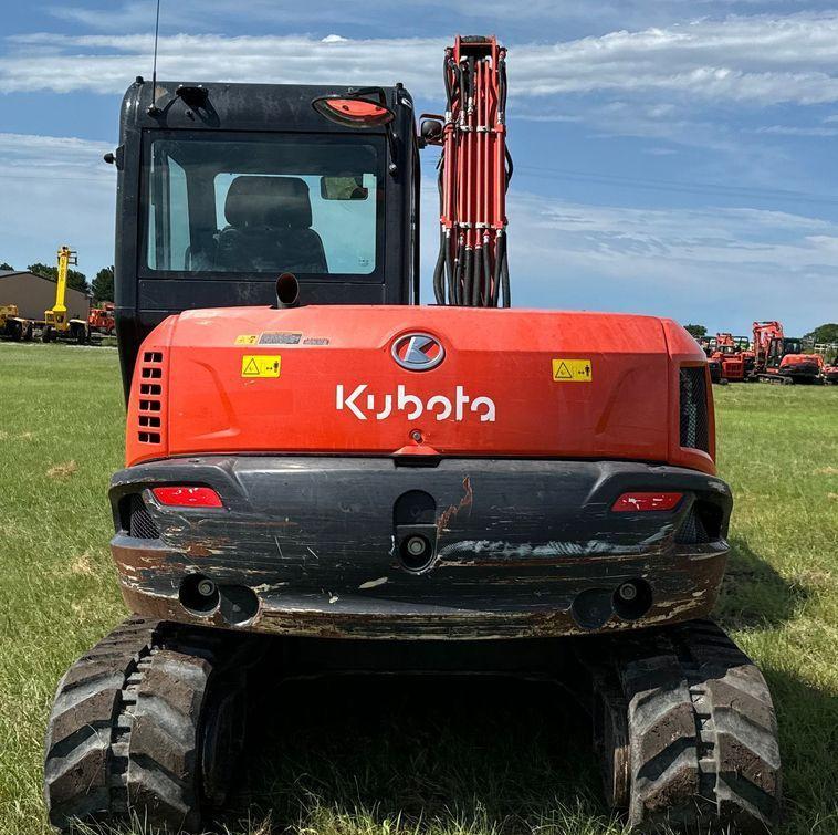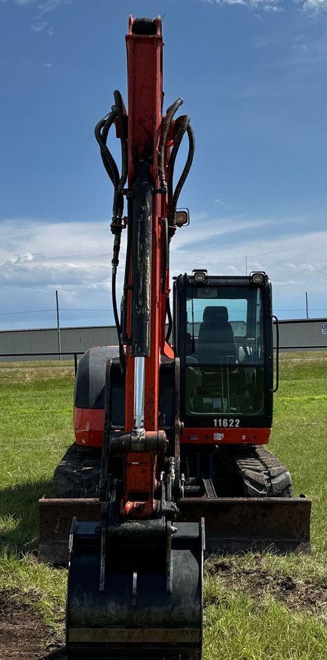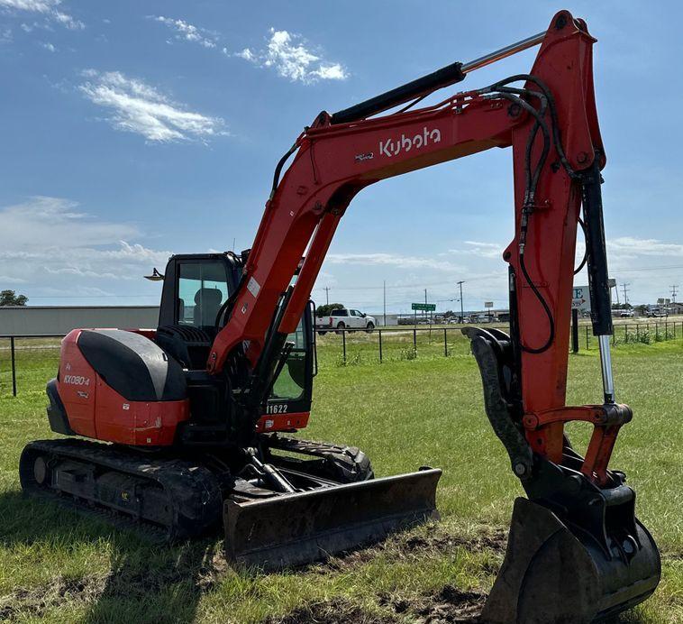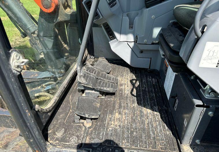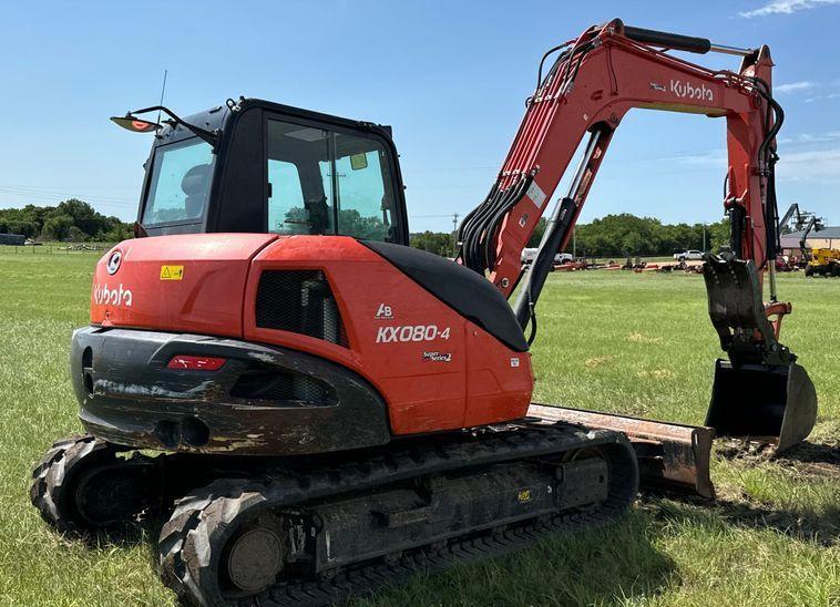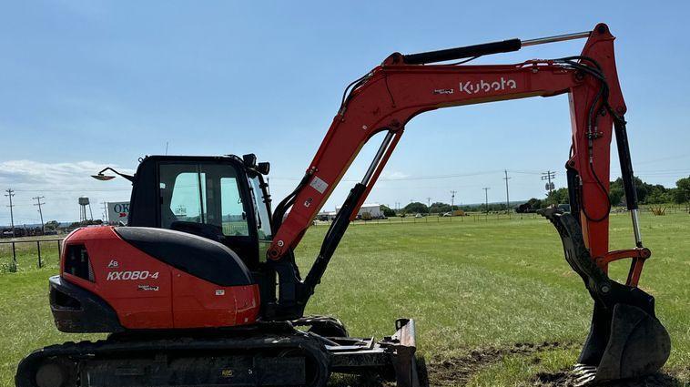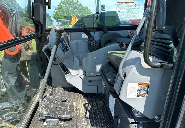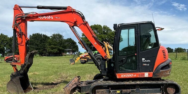 The 2021 Kubota KX080-4S2 mini excavator features 2,492 hours on the meter and is powered by a 3.3-liter, four-cylinder Kubota V3307-CR-T-EW05 diesel engine. Equipped with hydrostatic transmission, this machine offers smooth operation and precise control. The enclosed cab provides air conditioning, heat, and a pattern changer for operator comfort and flexibility. It includes two-way auxiliary hydraulics, an 86-inch backfill blade, and an 82-inch boom swing stick. The mechanical quick coupler and hydraulic thumb enhance attachment versatility, while the 29-inch bucket with five teeth delivers efficient digging. Mounted on 17-inch rubber tracks, this excavator is built for stability and performance across various terrains.
