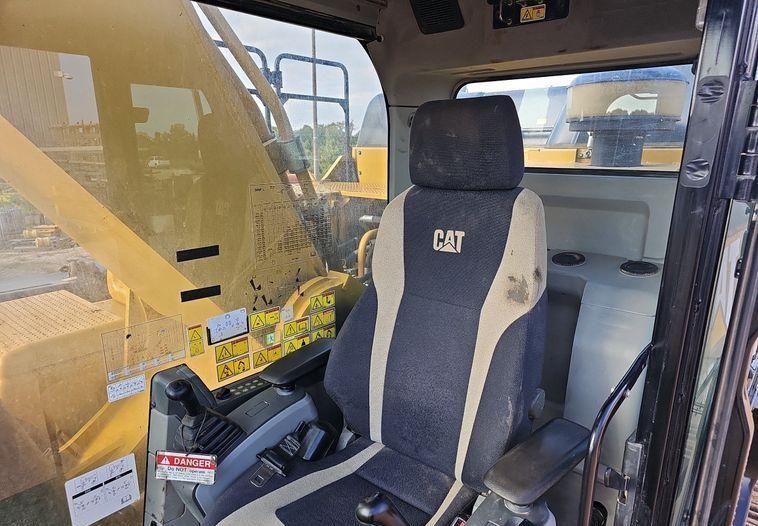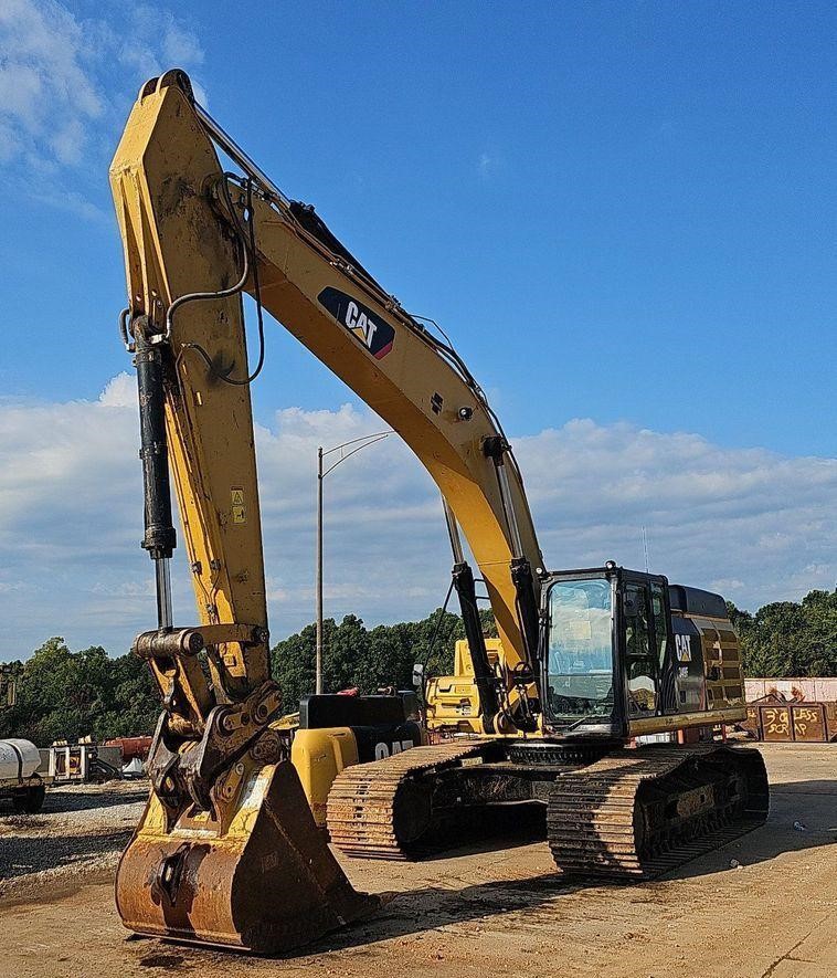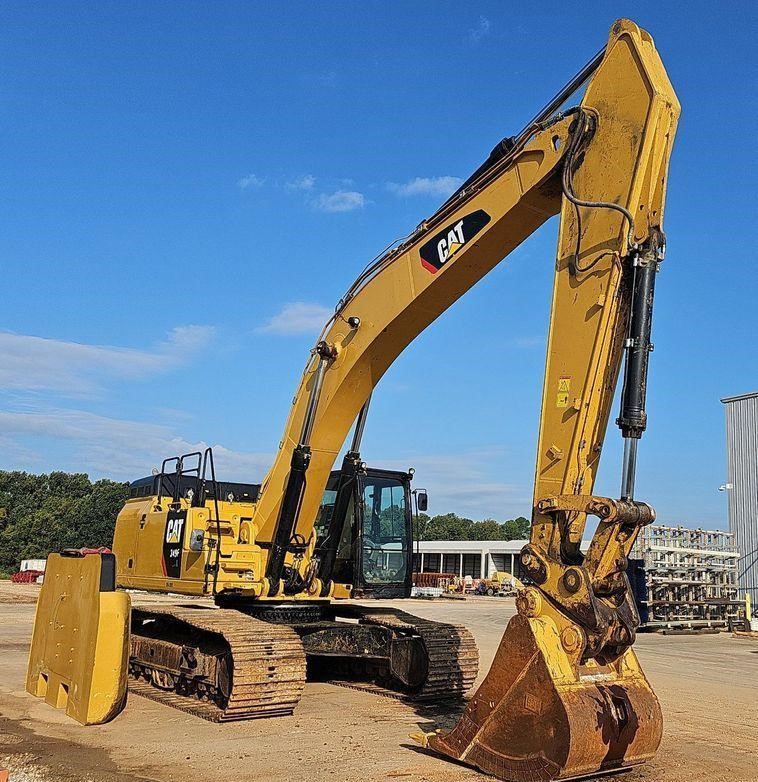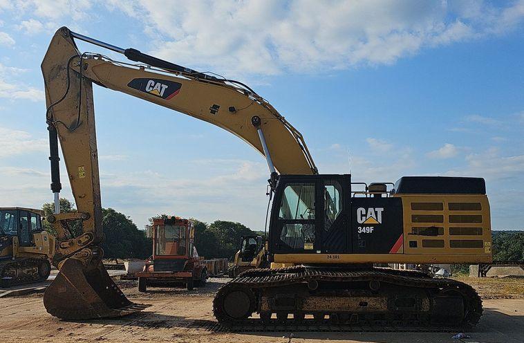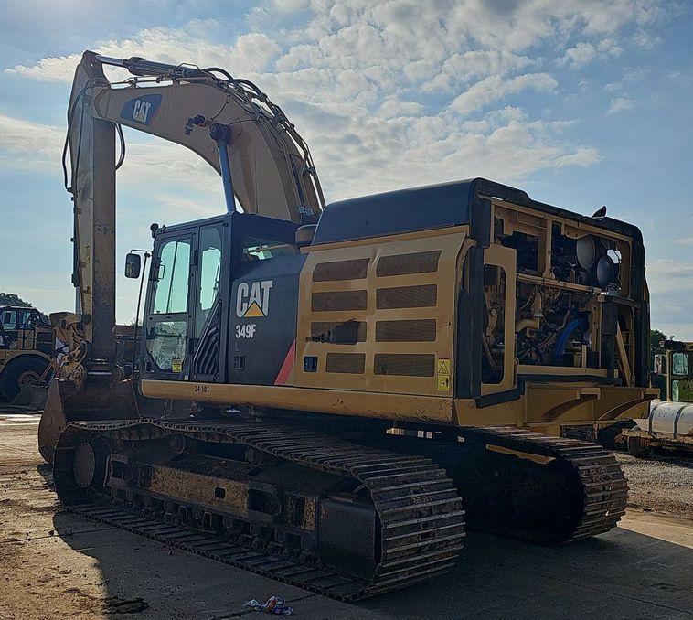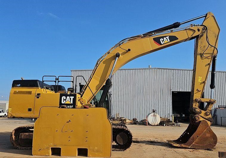 The 2018 Caterpillar 349FL excavator shows 7,659 hours on the meter and is powered by a 6-cylinder, 12.5L Caterpillar C13 diesel engine. It features a hydrostatic transmission and an enclosed cab equipped with air conditioning, heat, and a pattern changer. The machine includes counterweights, a standard boom, a hydraulic quick coupler, and a Caterpillar bucket that is 50 inches wide with five teeth. It runs on 36-inch-wide steel tracks with triple grouser pads.