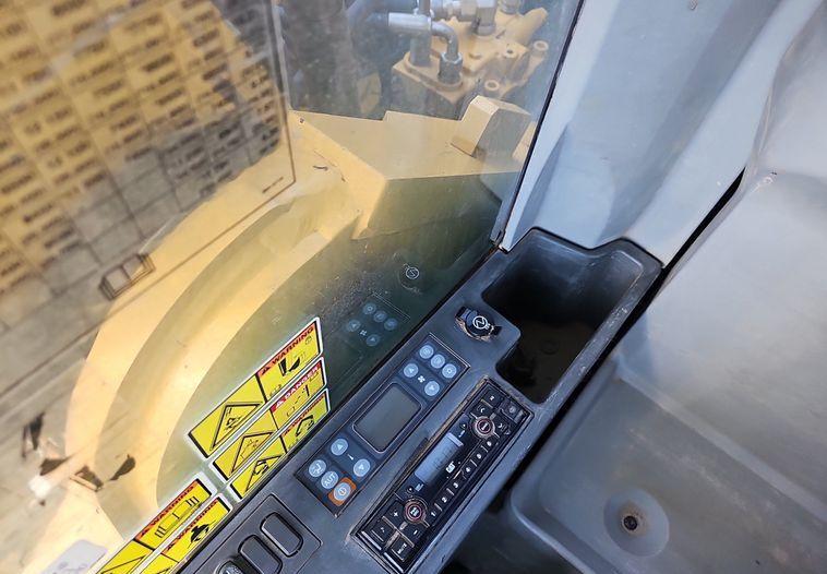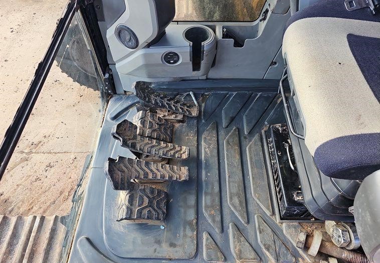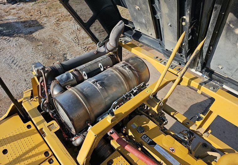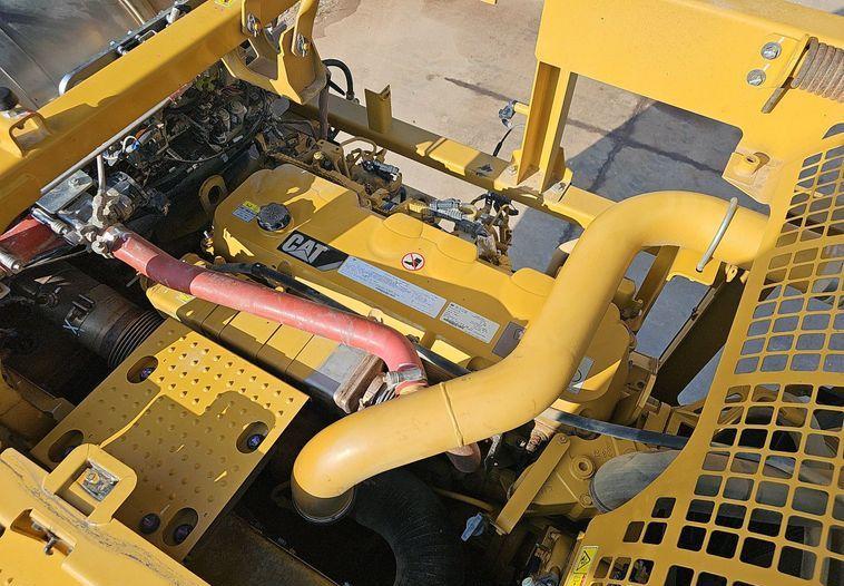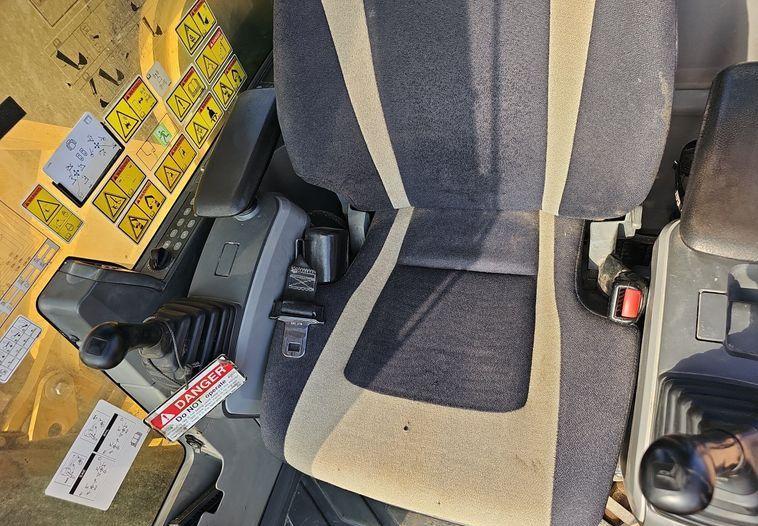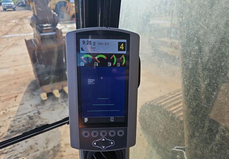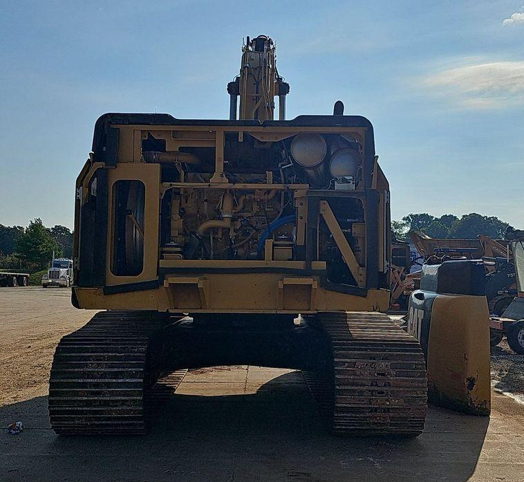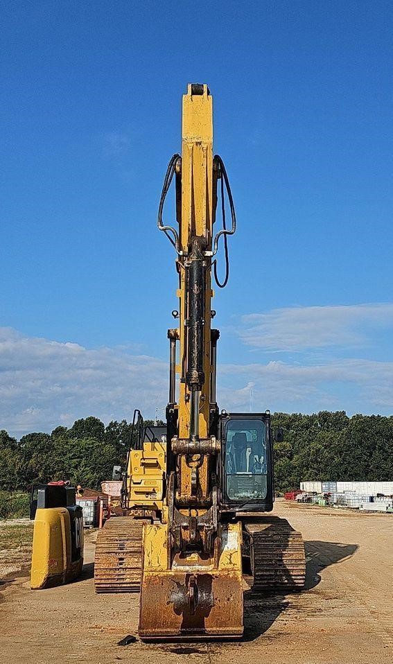 The 2018 Caterpillar 349FL excavator shows 7,659 hours on the meter and is powered by a 6-cylinder, 12.5L Caterpillar C13 diesel engine. It features a hydrostatic transmission and an enclosed cab equipped with air conditioning, heat, and a pattern changer. The machine includes counterweights, a standard boom, a hydraulic quick coupler, and a Caterpillar bucket that is 50 inches wide with five teeth. It runs on 36-inch-wide steel tracks with triple grouser pads.