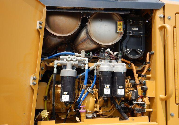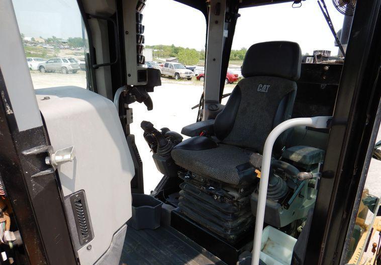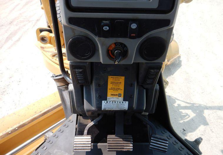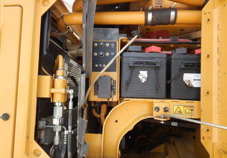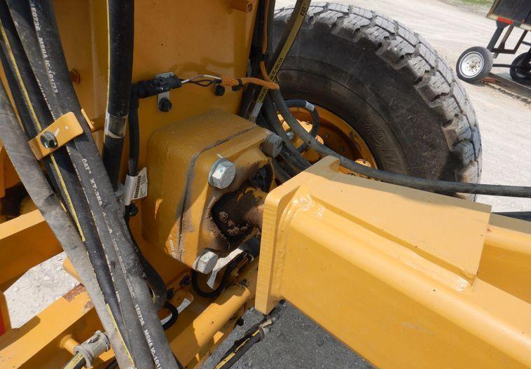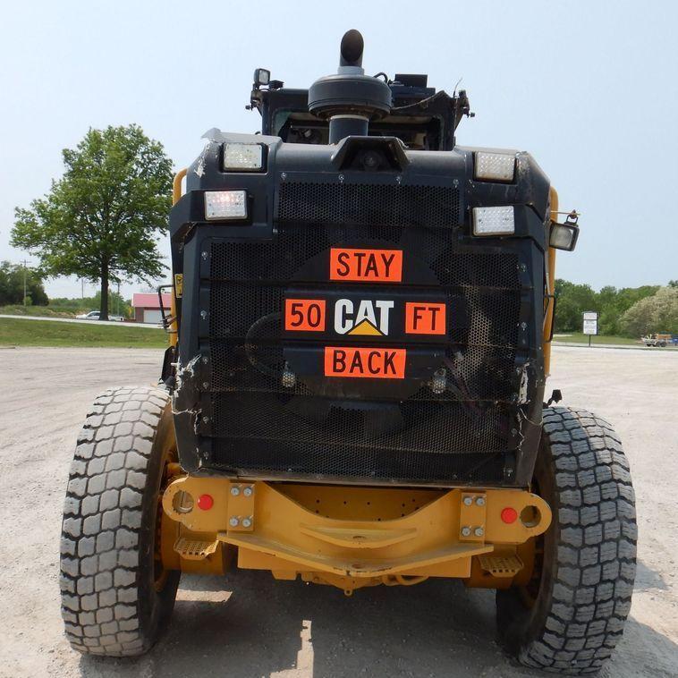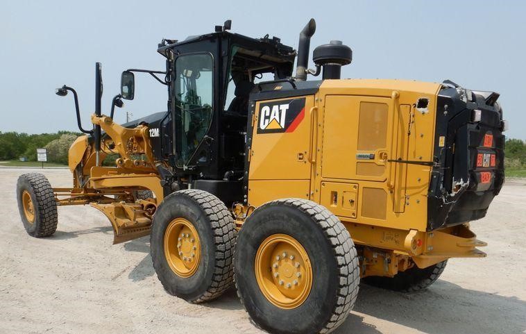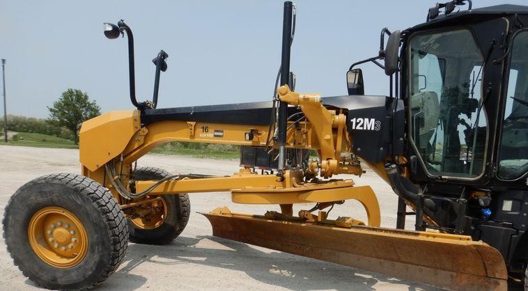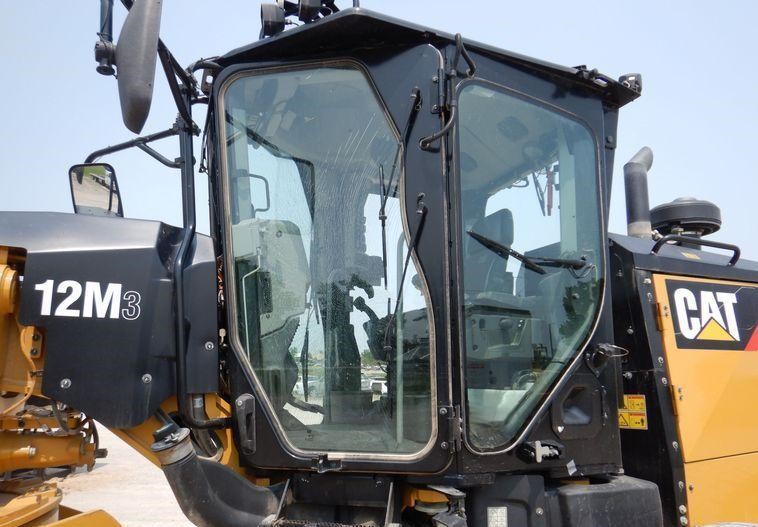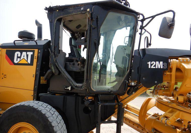 The 2019 Caterpillar 12M3 motor grader has 5,478 hours on the meter and is powered by a robust six-cylinder Caterpillar C9.3 diesel engine delivering 255 horsepower. It features a powershift transmission with eight forward and six reverse speeds, combined with a differential lock for enhanced traction. The operator station is equipped with an enclosed ROPS cab, air conditioning, heating, and joystick steering for precise control. This motor grader offers a 16-foot moldboard with tip control and side shift capabilities. Tires are size 14.00R24.