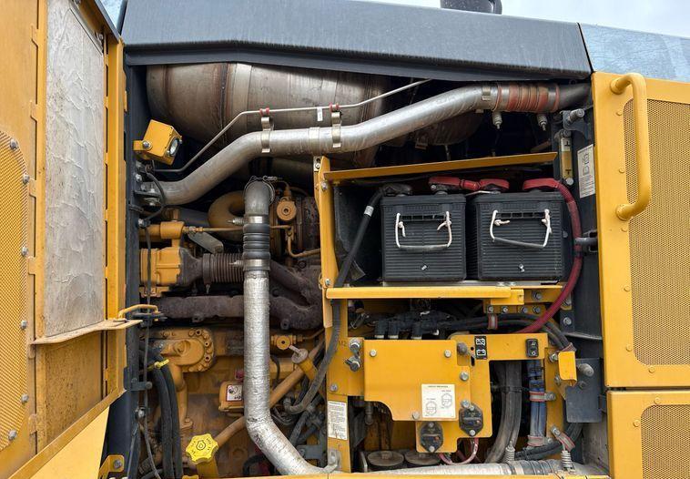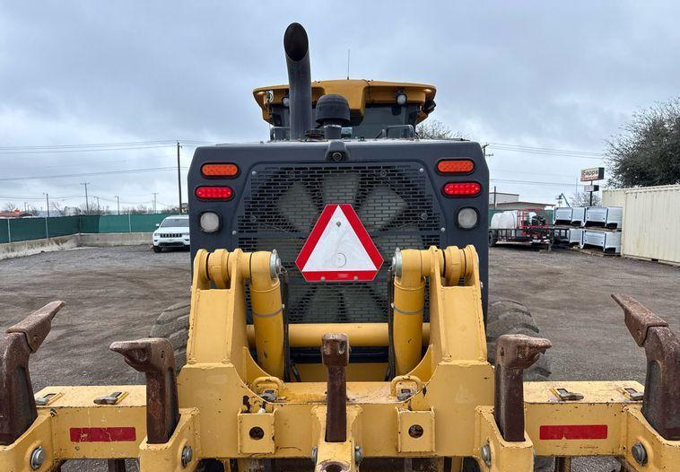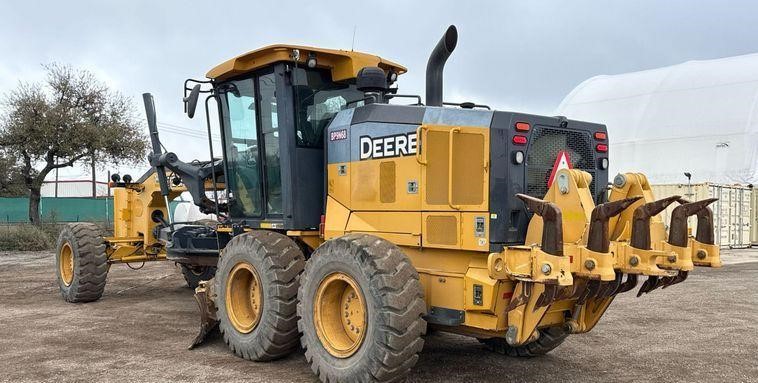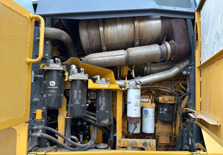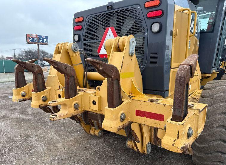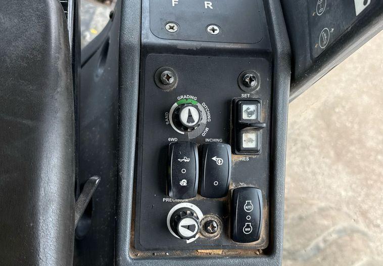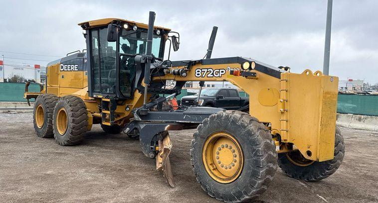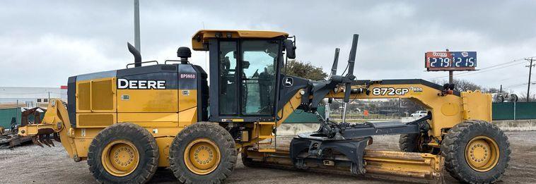 The 2015 John Deere 872GP motor grader shows 7,409 hours on the meter. It is powered by a John Deere 6090HDW18 six-cylinder diesel engine. The transmission is Powershift with 8 forward and 8 reverse gears. The chassis includes all-wheel drive and a differential lock. The operator�s station is an enclosed cab with AC, heat, backup camera, and combination steering.