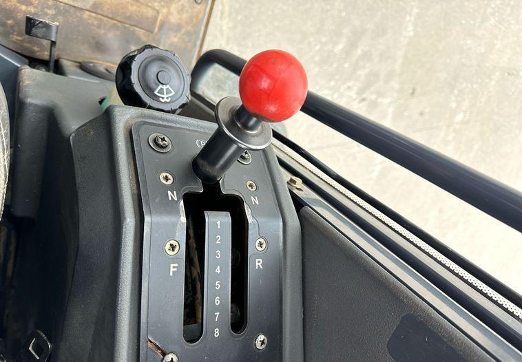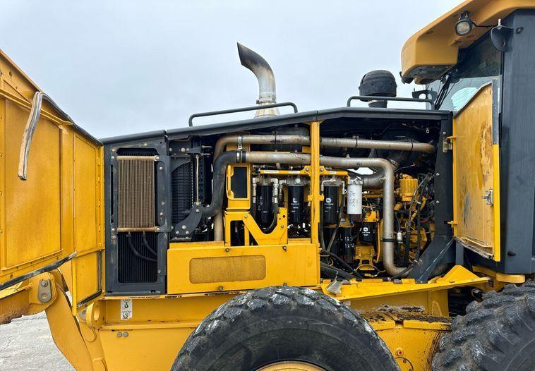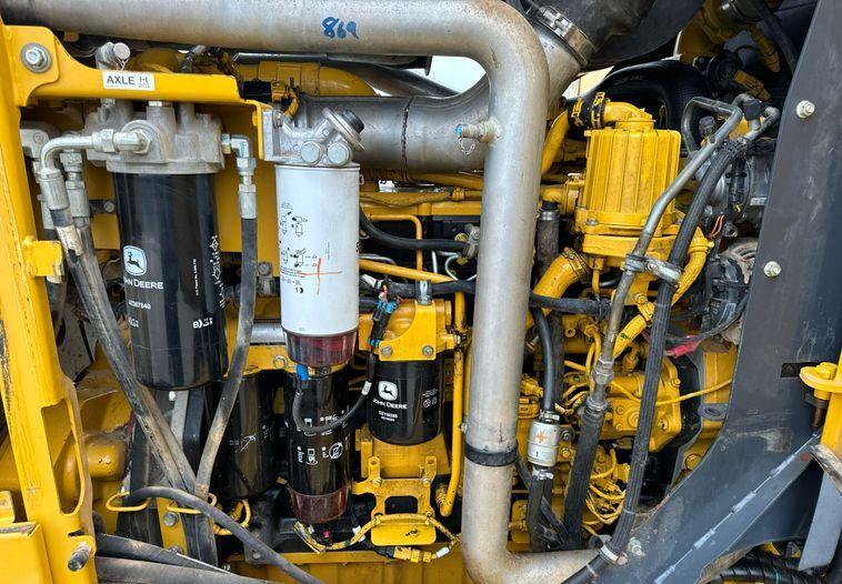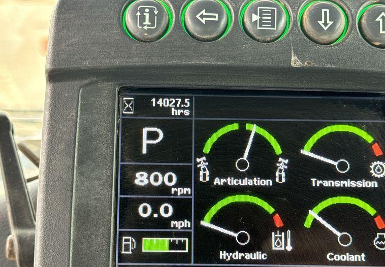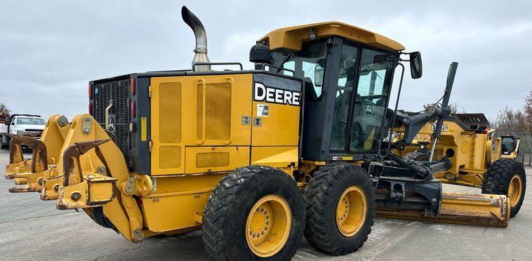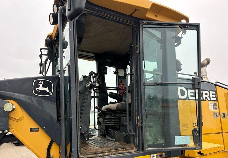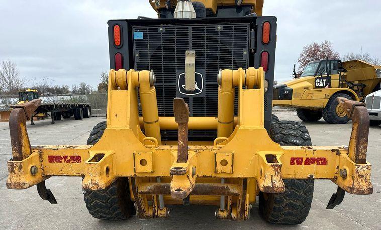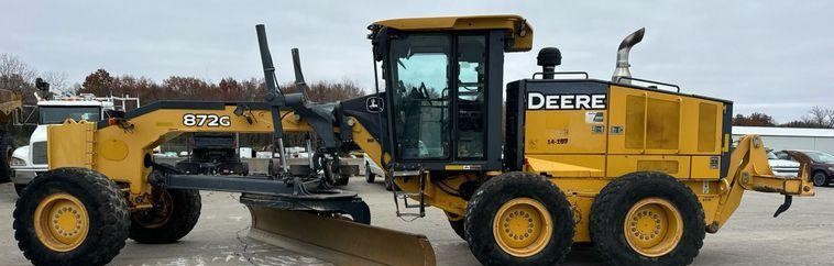 The 2013 John Deere 872G motor grader has 14,027 hours on the meter. It is powered by a 6-cylinder 9.0L diesel engine with a powershift transmission featuring 8 forward and 8 reverse gears. The chassis is all wheel drive with a differential lock.
