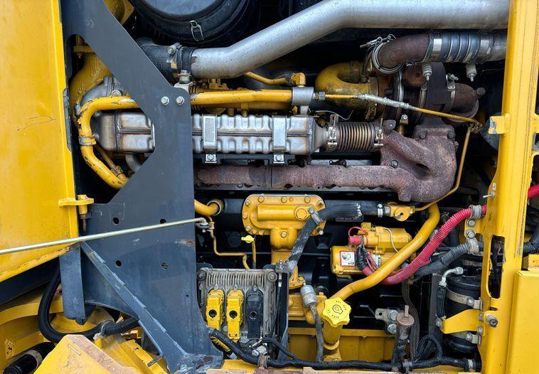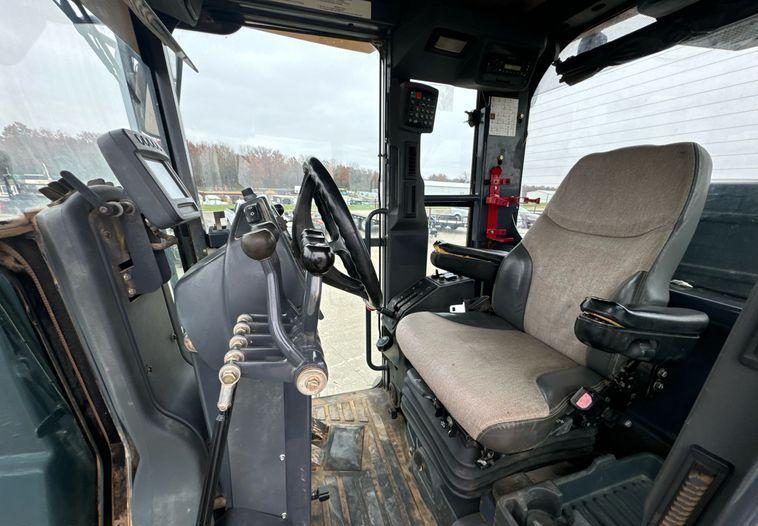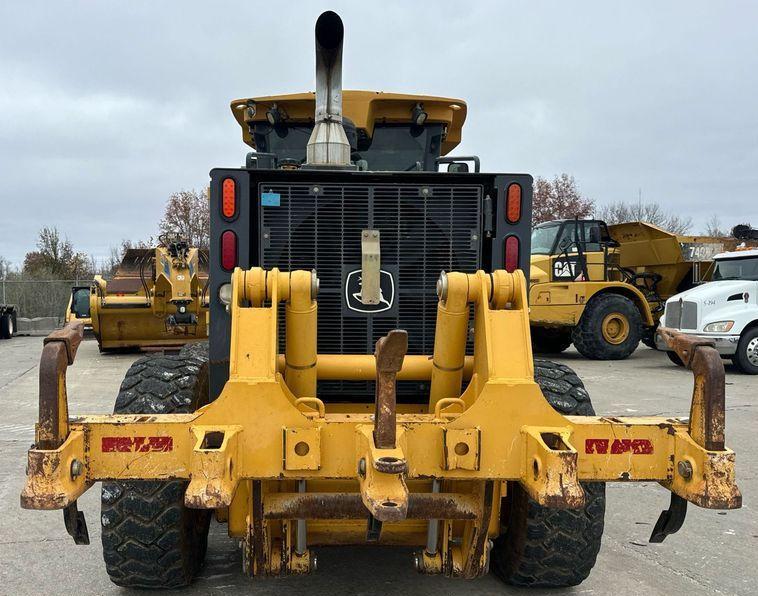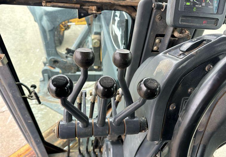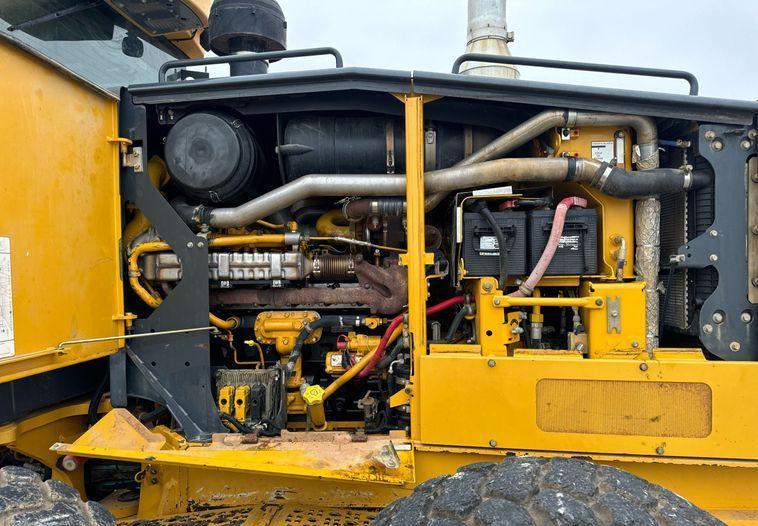 The operator�s station includes an enclosed cab with AC and heat, and it is equipped with 9 hydraulic control valves. Features include a 16-foot moldboard with tip control and side shift, a front-mounted push block, and a rear ripper with 3 shanks. It also has 3 scarifier teeth. The tires are sized 17.5R25.